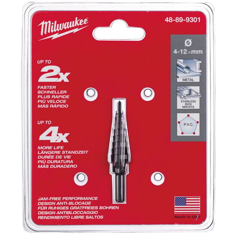 The Milwaukee Step Drill 48899301 is a versatile 9‑step bit that drills and enlarges holes from 4 mm to 12 mm using a single tool. Engineered from high‑quality steel with a black oxide finish, it delivers long life and smooth cutting performance in ferrous and non‑ferrous metals, stainless steel and plastics. Its stepped design creates clean, burr‑free holes and eliminates the need for multiple bits, while laser‑engraved size markings ensure easy identification.